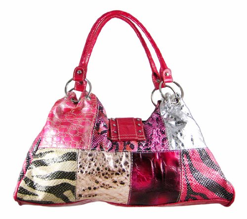 This beautiful hot pink Western style handbag features multi-textured animal print patchwork, accented by mock croc trim, chrome plated studs, and a large kippy style buckle encrusted with dozens of sparkling crystal rhinestones. The purse is made of vinyl, and has a black polyester lining with a reinforced zipper pocket and 2 small pockets for small items. It measures 18 inches wide, 8 1/2 inches tall, and 4 inches deep, and the handles have a 9 inch drop. This gorgeous bag is divided into 3 sections by a zipper compartment in the middle, while magnetic snaps securely hold the sides closed. It`s great for everyday use or for a night on the town. These won`t last long, so get yours now!