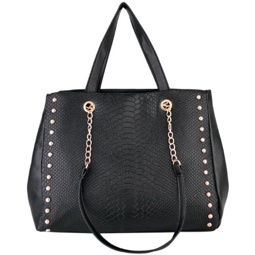 - Classic black handbag features a faux crocodile texture and gold-tone studs on the front that make it a truly glamorous accessory.