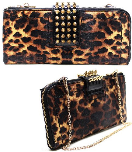PURSE AND BAG / CLUTCH / POLYURETHANE / SPIKE / ANIMAL PRINT / MAGNETIC CLOSURE / INSIDE ONE ZIP AND TWO OPEN POCKETS AND CARD HOLDER POCKETS / REMOVABLE CHAIN STRAP / H 5 INCH X W 11 INCH