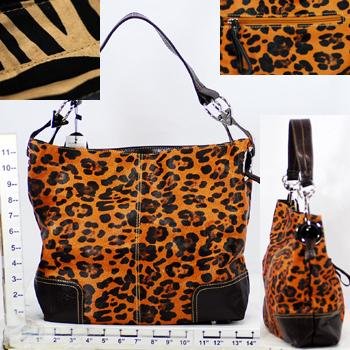 PURSE - LEOPARD PRINT SHOULDER BAG ~ VINYL WITH COFFEE LEATHER LOOK TRIM / STRAP ~ Approximately 11" Tall x 13" Wide. (Please see Picture for further sizing information).