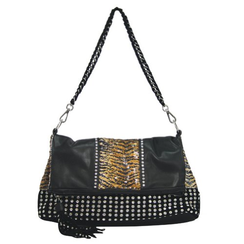 Make a statement with this stunning and unique bag. Made from textured synthetic leather with crystal studs and silver-tone hardware. Single chain carrying handle and zip top flap over closure. Roomy fully lined fabric compartment. Interior zip wall pocket, cell and sunglass slip pouches. Handle drop: 12". Body of bag: 14" L x 9" H x 3" W. BEFORE PURCHASING, PLEASE COMPARE THE SIZE OF THIS HANDBAG TO ONE OF YOUR OWN FAVORITE BAGS.