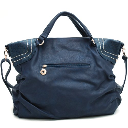 Designer Inspired Large Ostrich Patched Tote Handbag w/ Multi-Stud & Rhinestone Accents Navy Designer Inspired Large Ostrich Patched Tote Handbag w/ Multi-Stud & Rhinestone Accents Navy